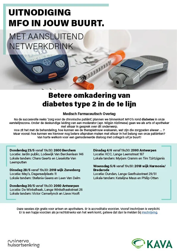 Kruimelpad Home Agenda MFO: diabetes type 2 Datumdonderdag 23 mei 2024, 19:30 - 21:30 Adres Lodewijk Van Berckenlaan 146, 2600 Berchem Doelgroep Arts en apotheker Leervorm Medisch farmaceutisch overleg INSCHRIJVEN